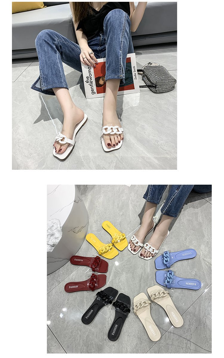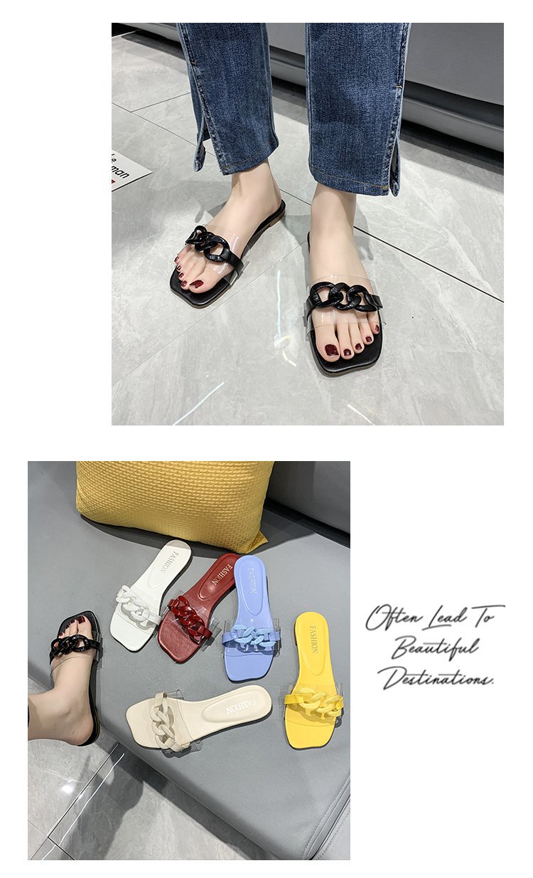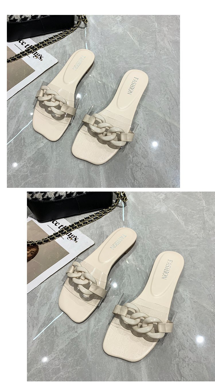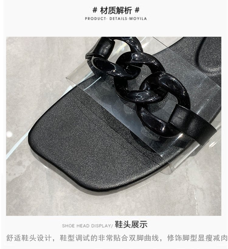 Women Clear Uppers Chain Decor Sandals Open Square Toe Slip on Flat Slides Transparent Beach Party Shoes