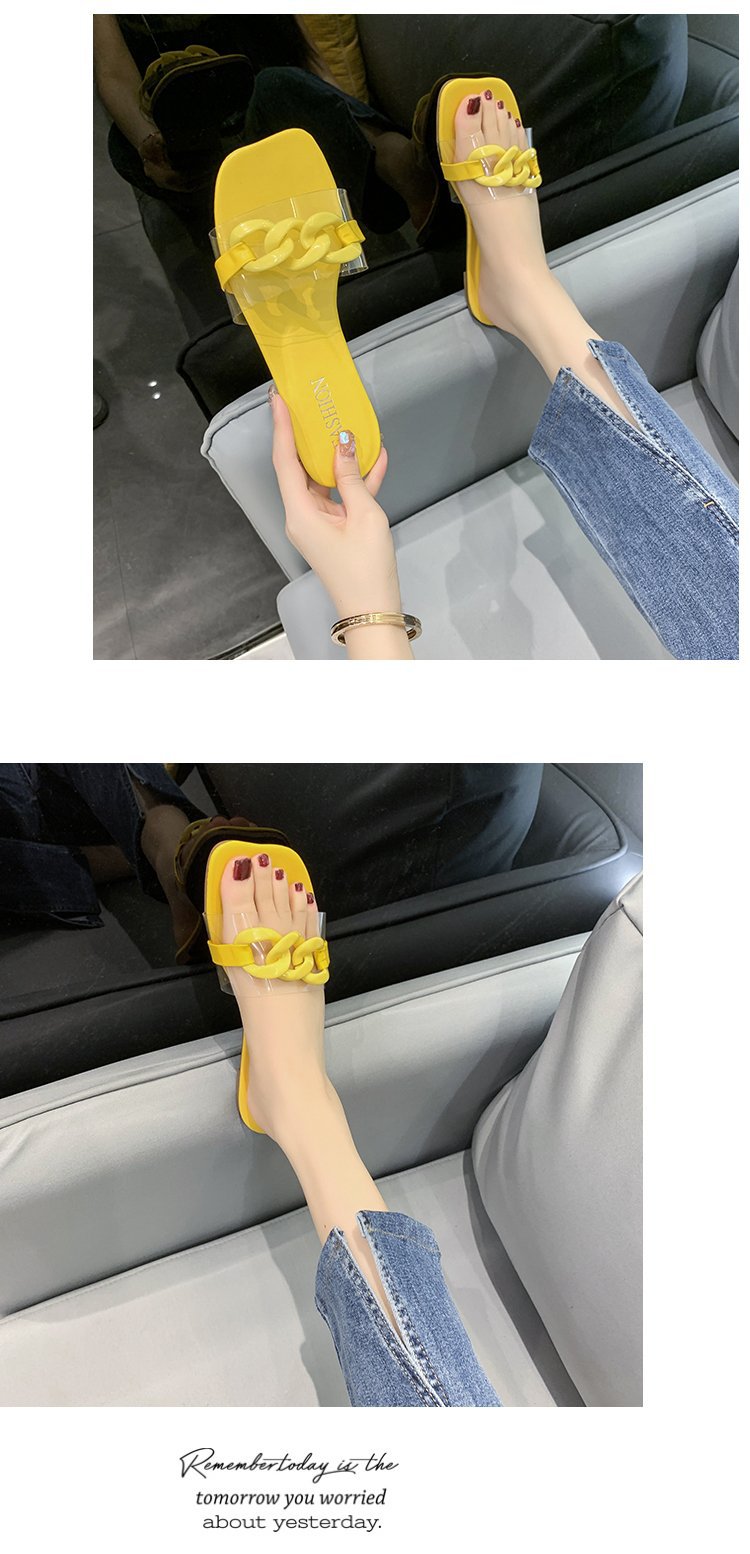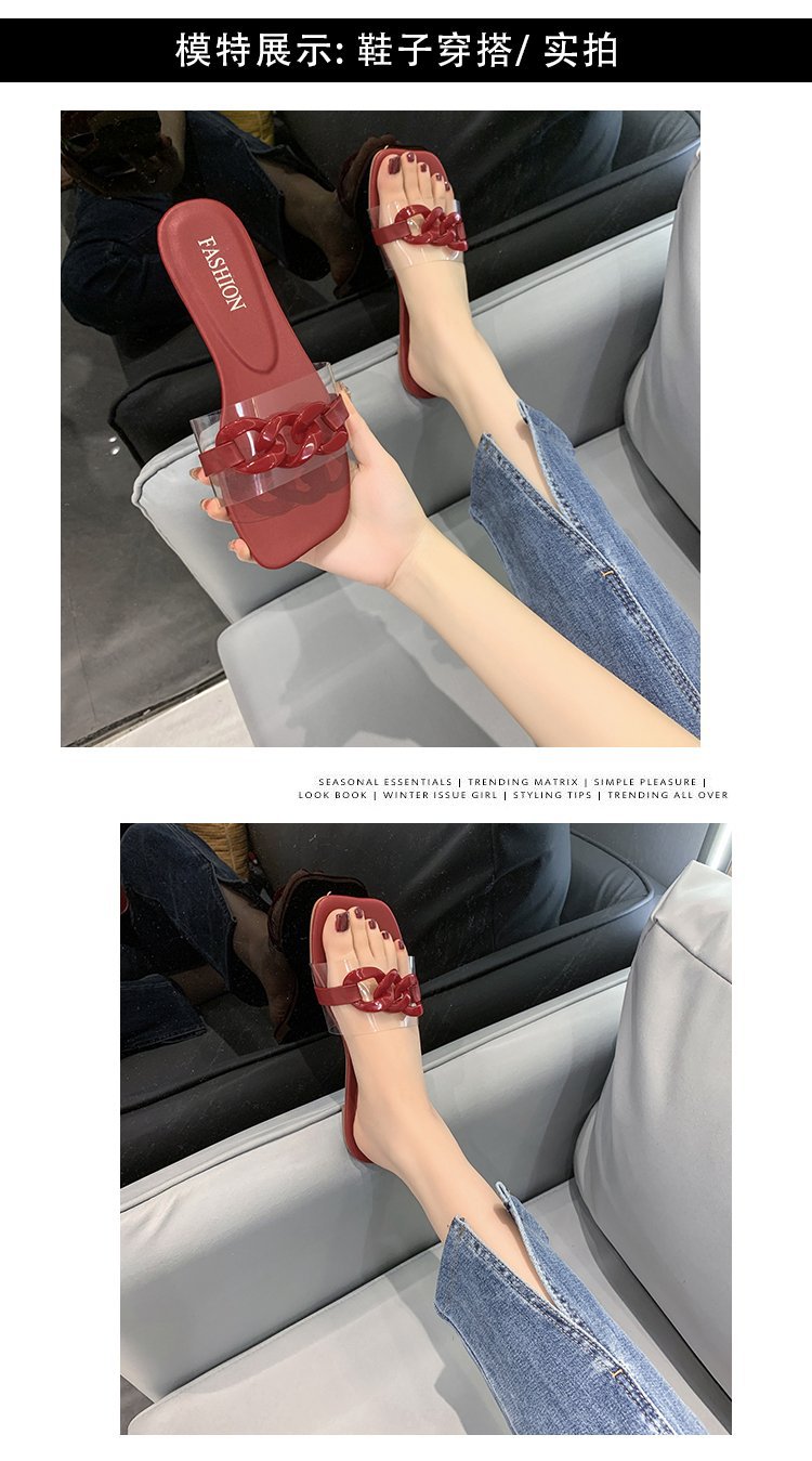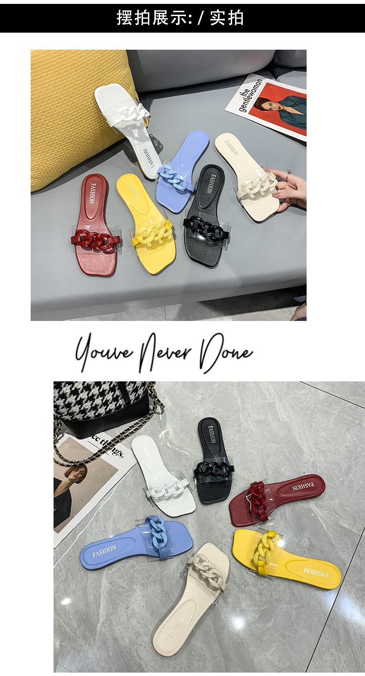 Women Clear Uppers Chain Decor Sandals Open Square Toe Slip on Flat Slides Transparent Beach Party Shoes