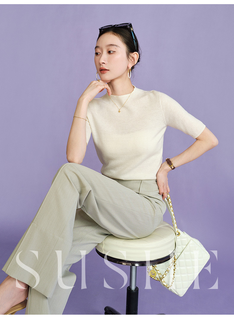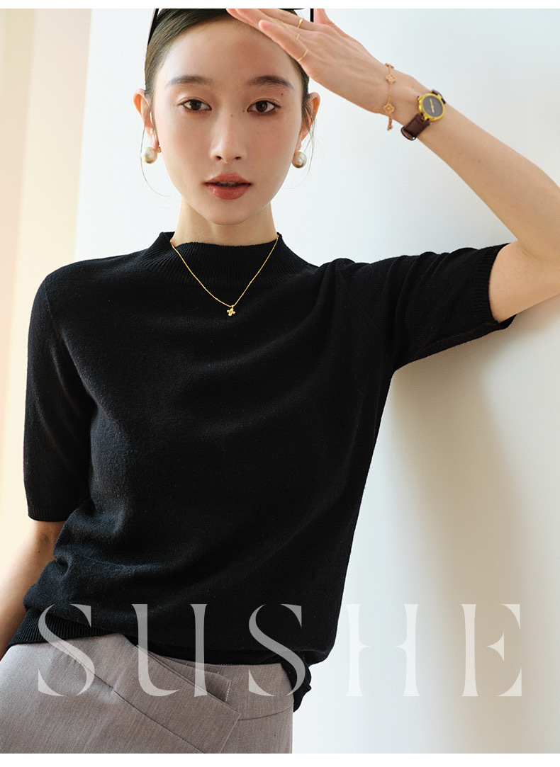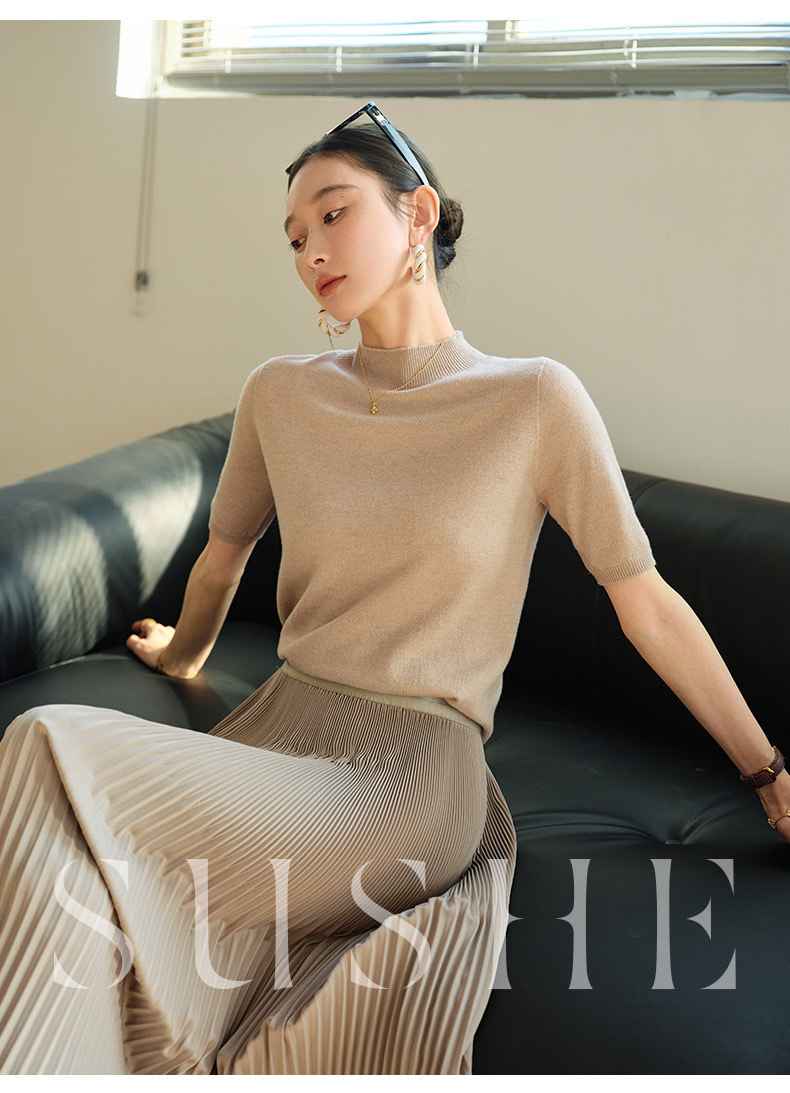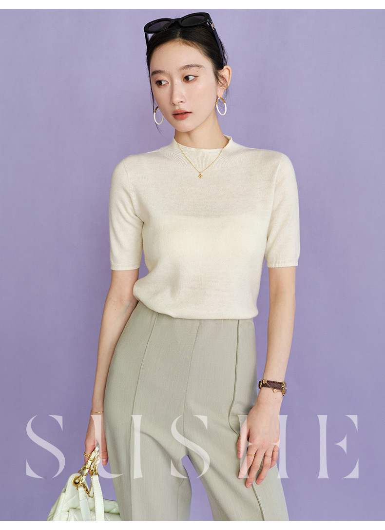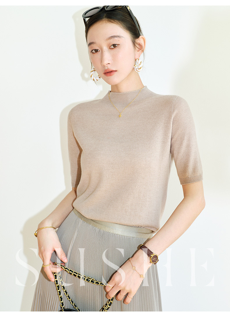 2024 Summer wool knitted sweater women's simple inner half sleeve high-grade half turtleneck sweater top women's Korean style