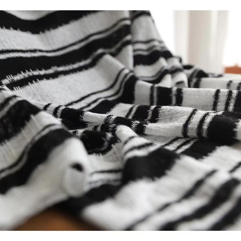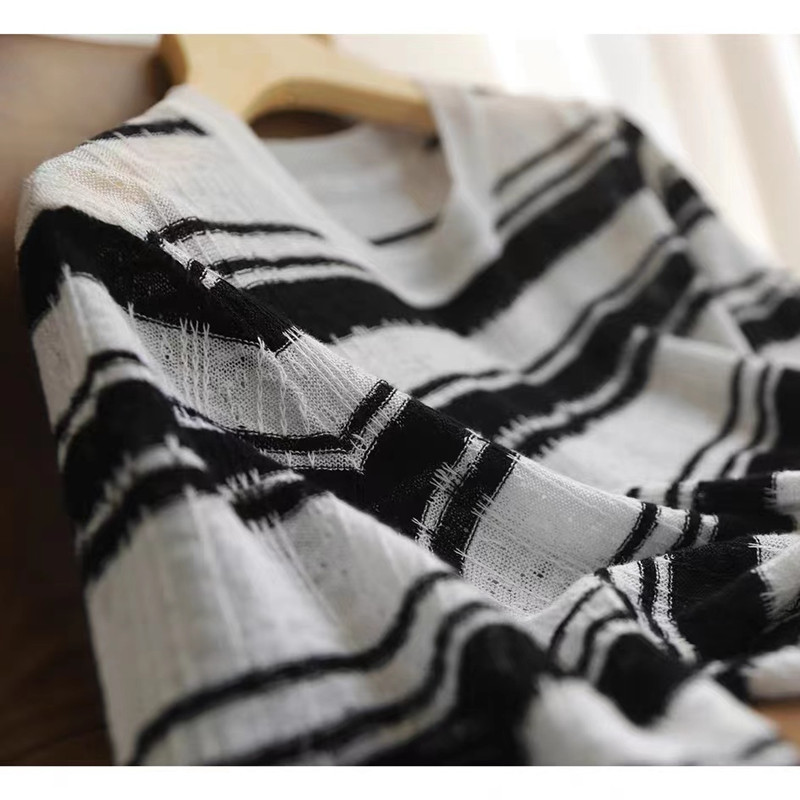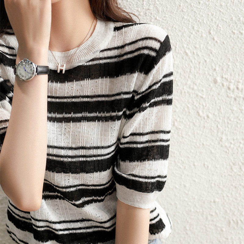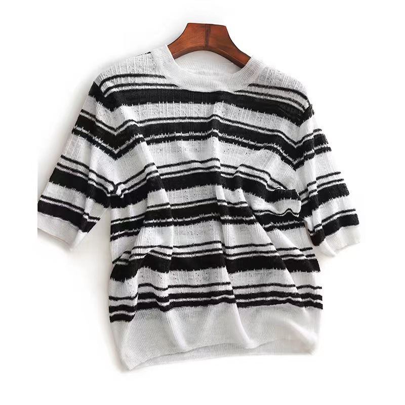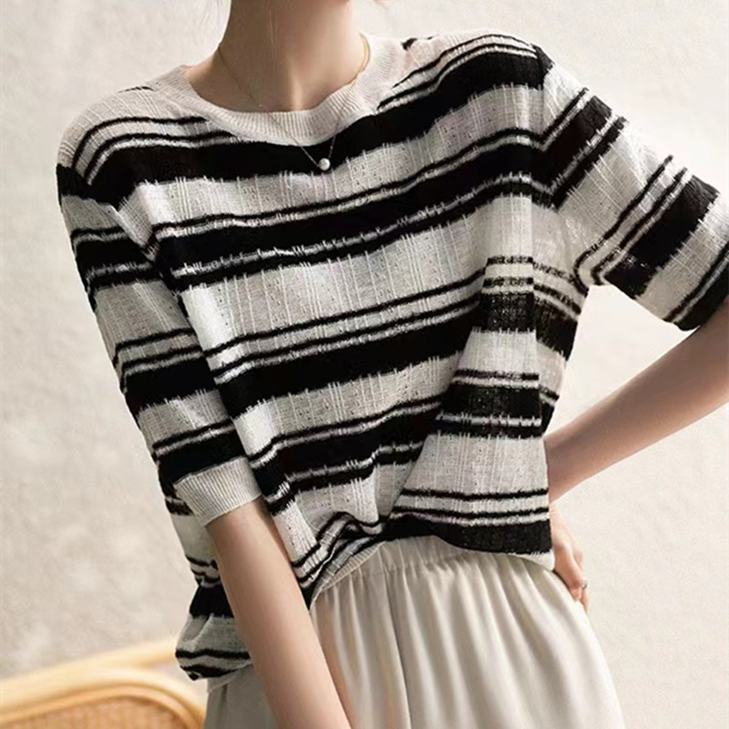 2024 spring new women's clothing age-reducing loose striped fashion short-sleeved sweater retro high-end all-matching top