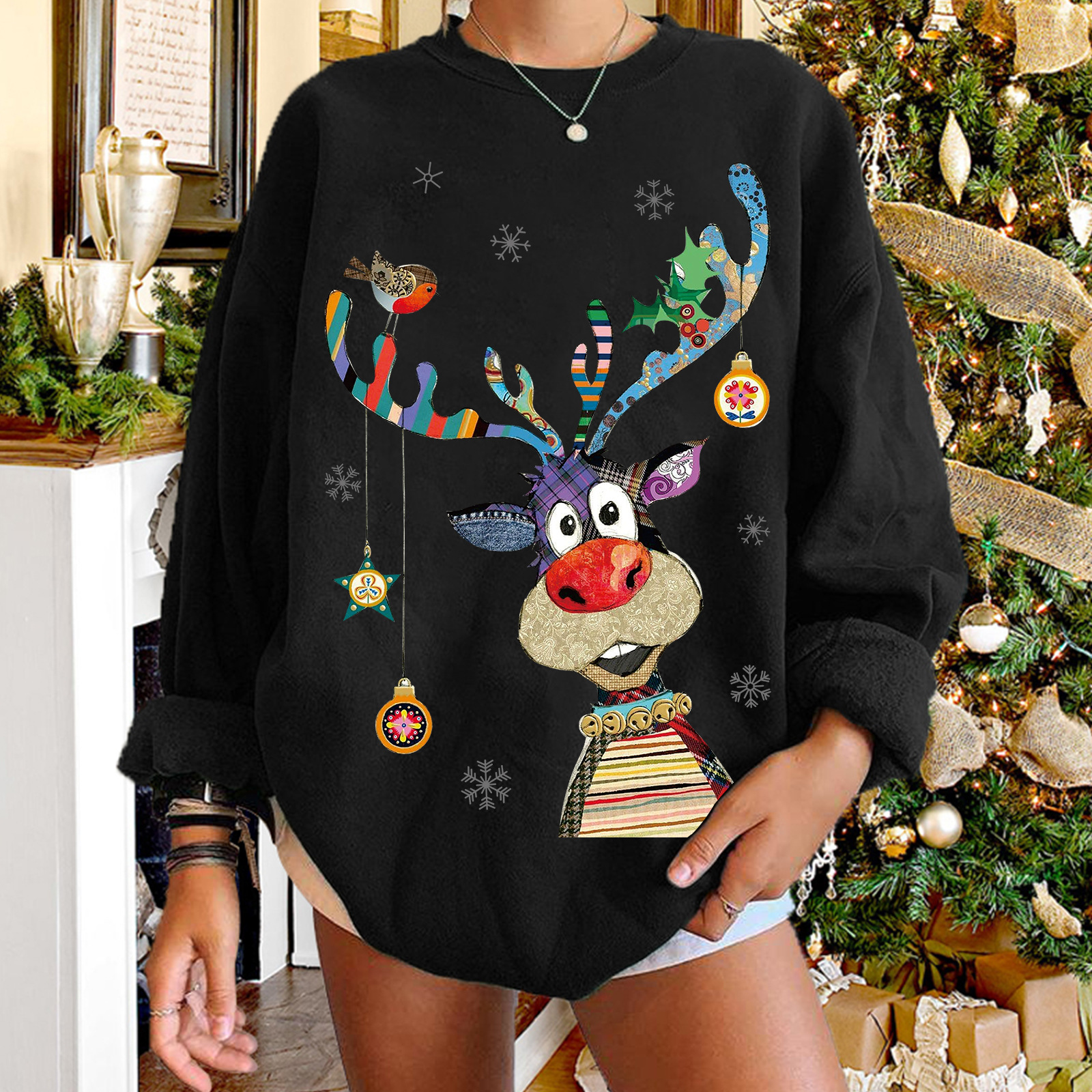 ins Style Big Figure Christmas Elk Cute Sweater Printed Women's Shoulder-drop Large Size European and American Round Neck Fleece Sweater Women