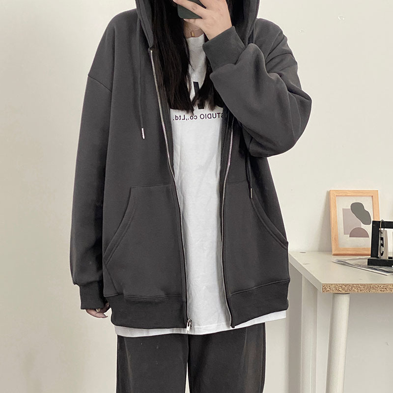 Dark Grey Sweatshirt Women's Fleece Coat Autumn and Winter New Korean Style Loose Lazy Style Long Sleeve Top Instagram Style Trendy