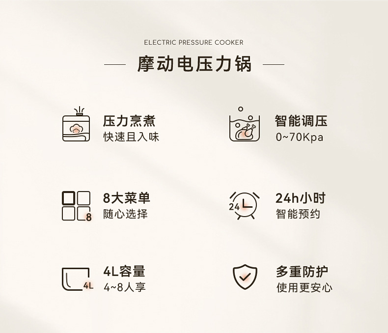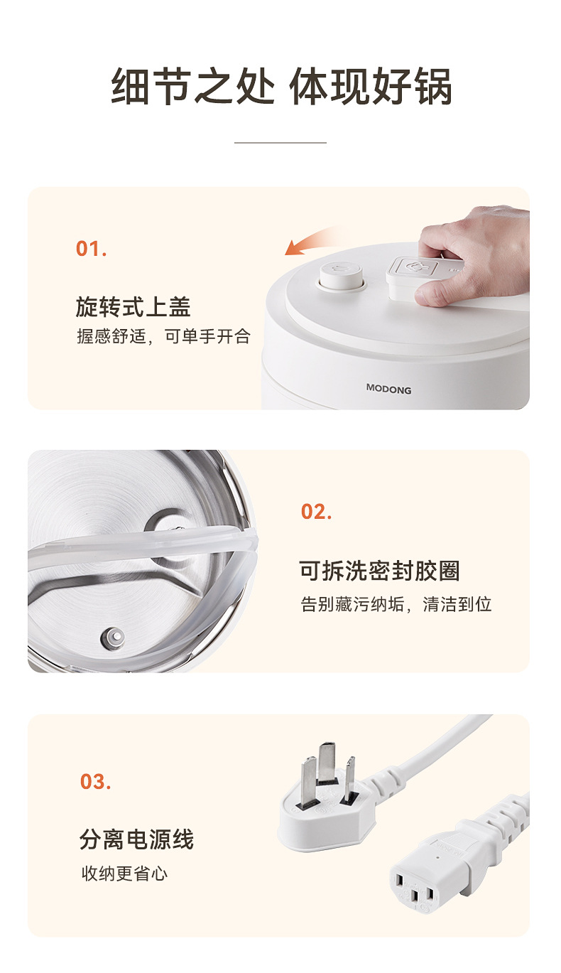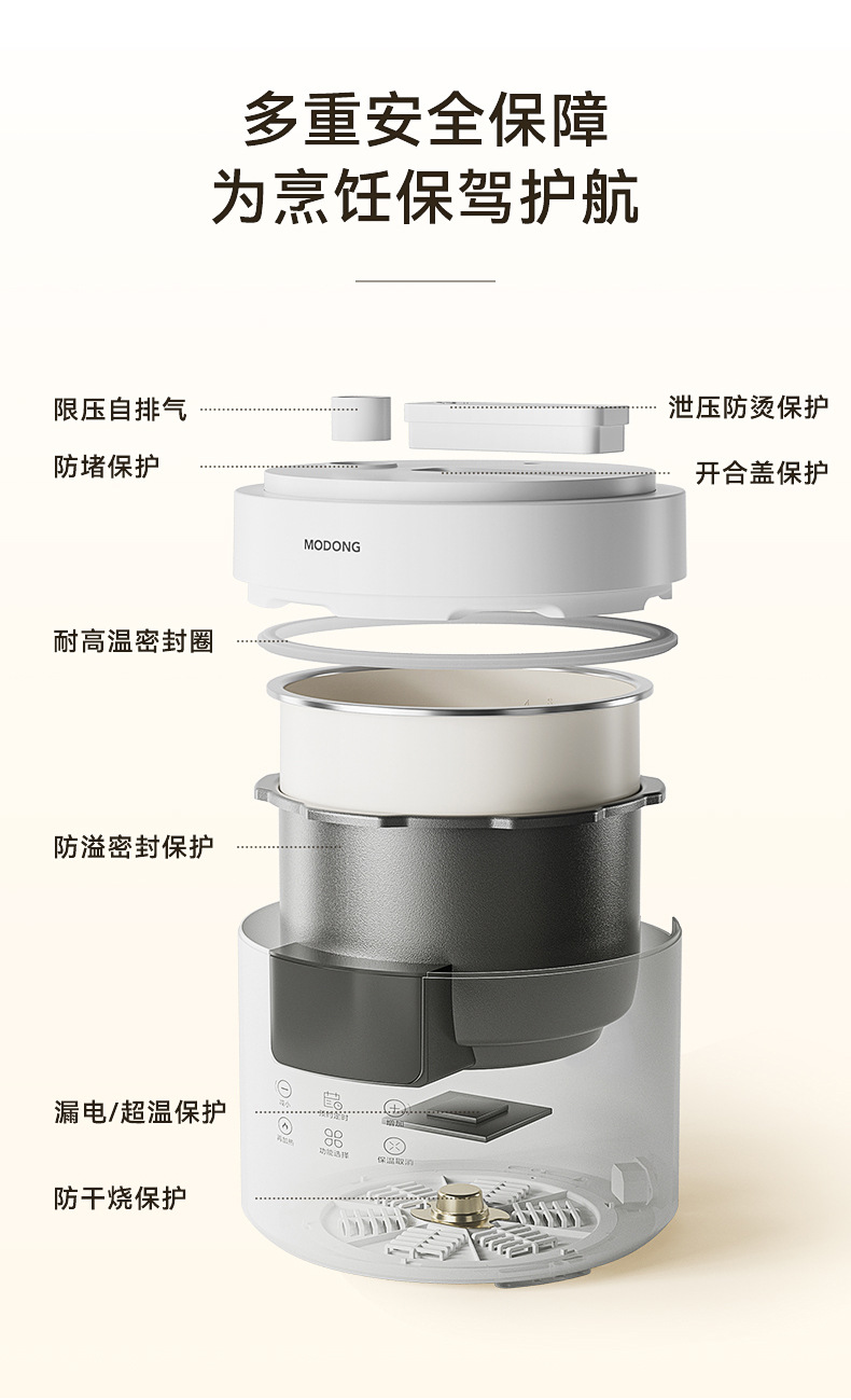 9、反向泄压排气,一键按压,远离排气孔,避免被烫伤;多重安全保障,为烹饪保驾护航