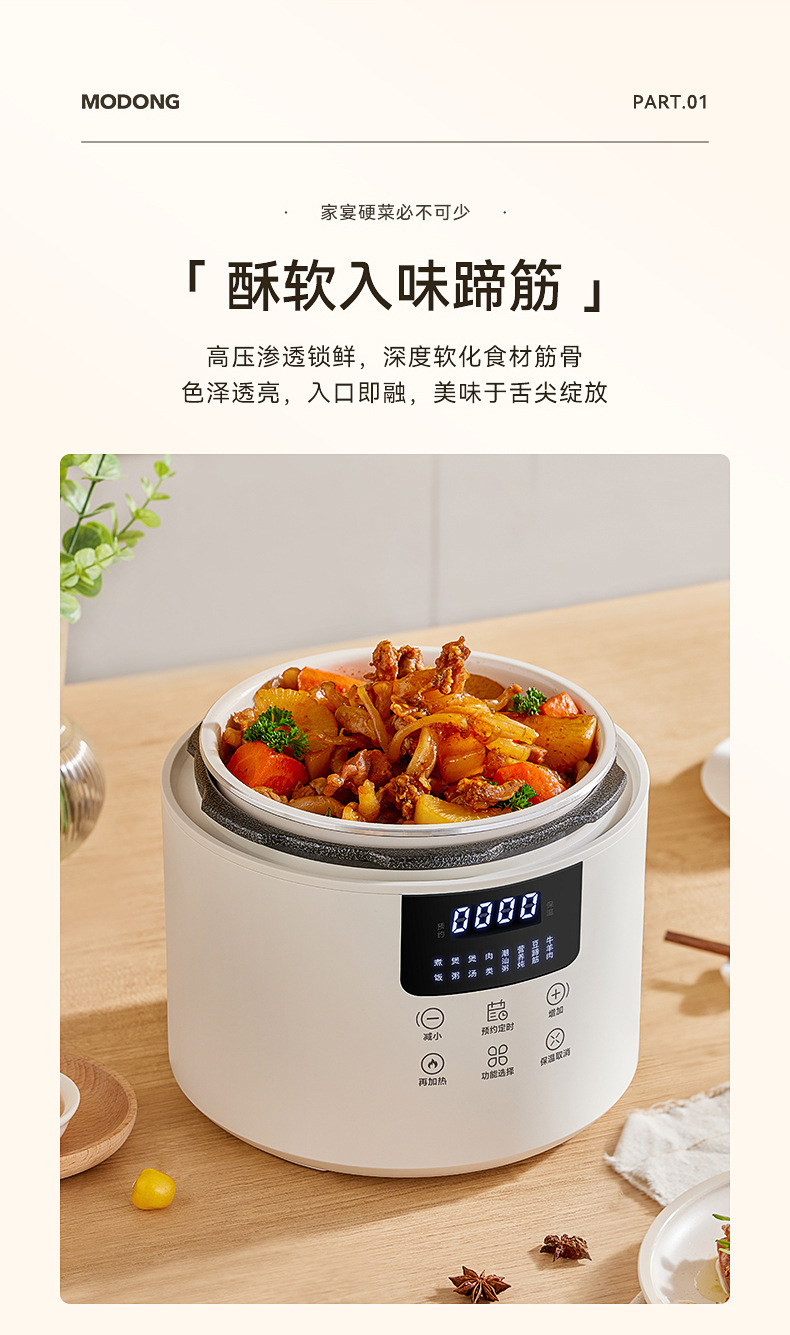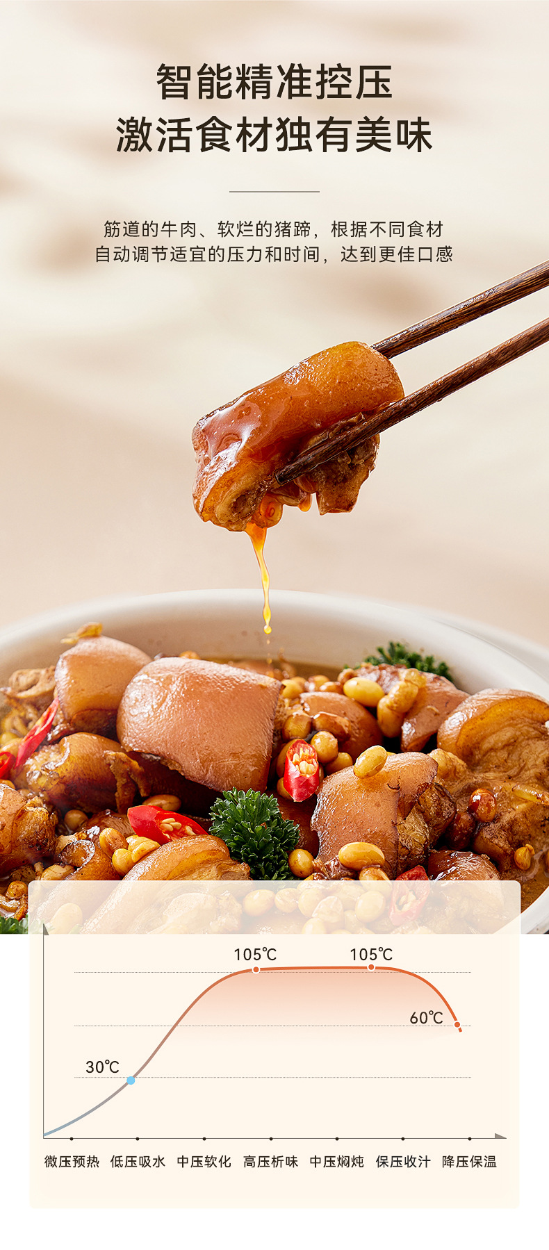 1、压力烹煮,快速炖透高难度硬菜,0~70kpa智能精准控压,激活食材独有美味