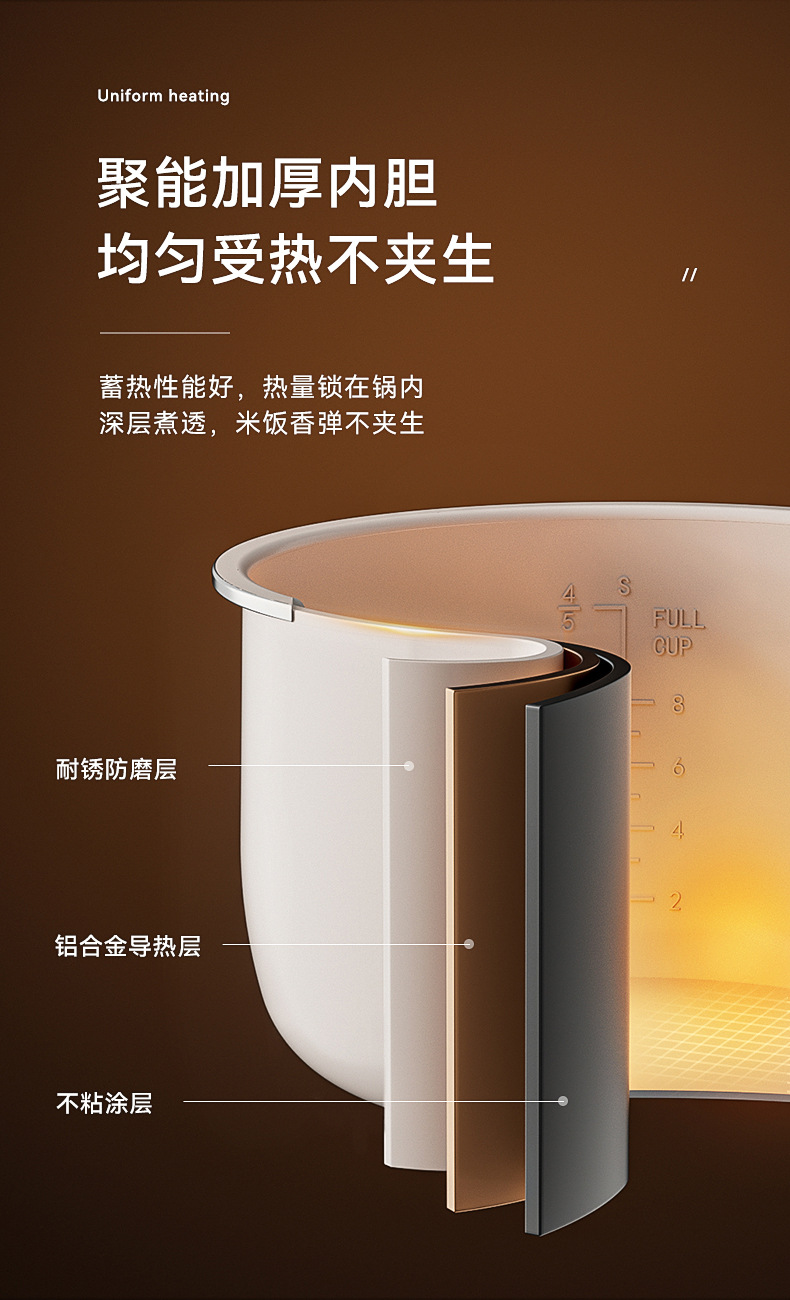 8、聚能加厚内胆,铝合金材质,导热性蓄热性更好,热量锁在锅内,米饭深层煮透不夹生