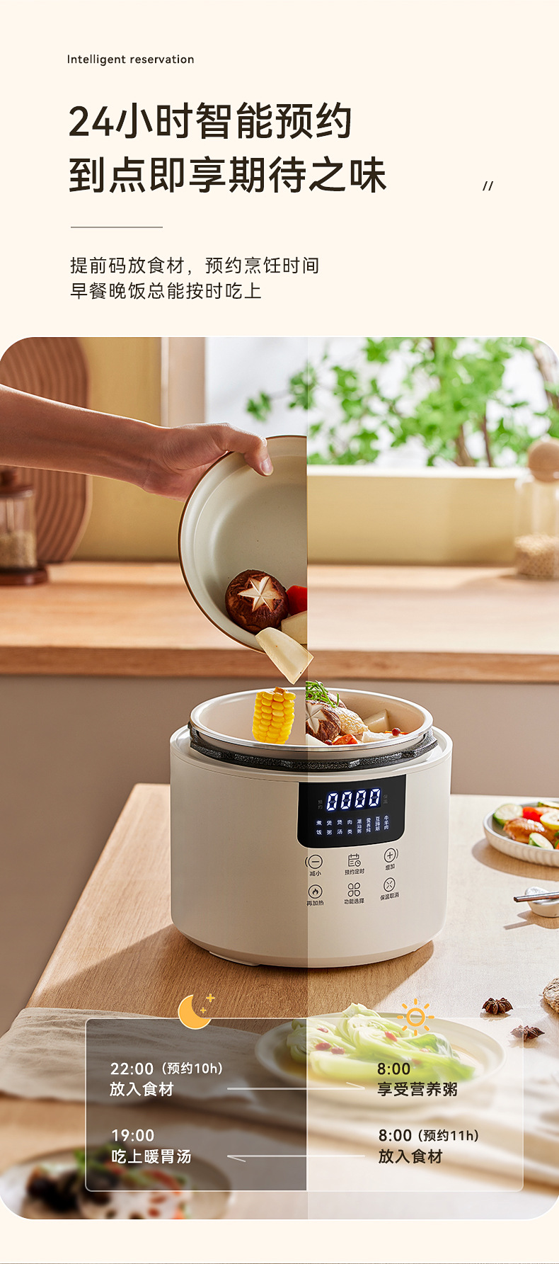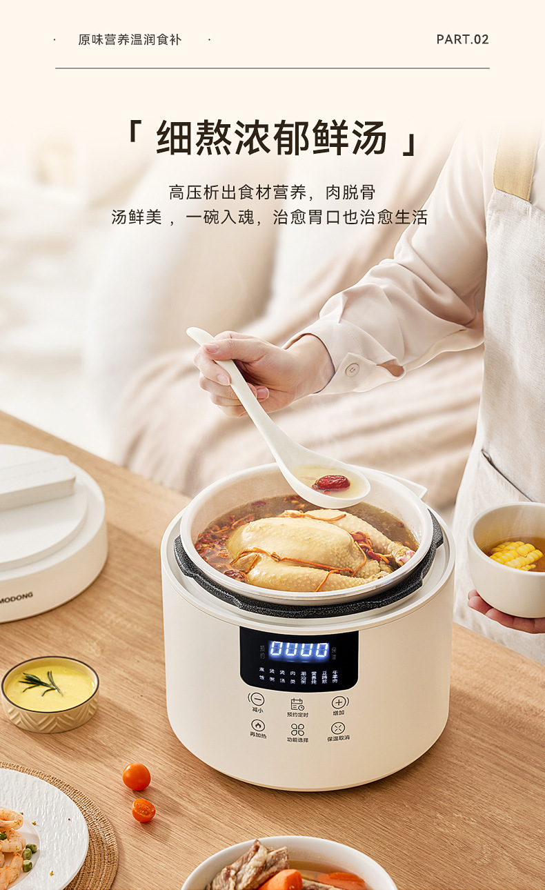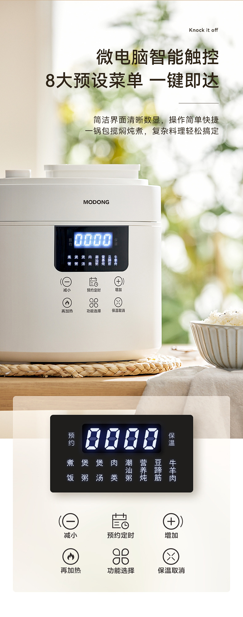 4、8大预设菜单,煮饭/煲粥/煲汤 /肉类/潮汕粥/营养炖/豆蹄筋/牛羊肉,满足一日三餐